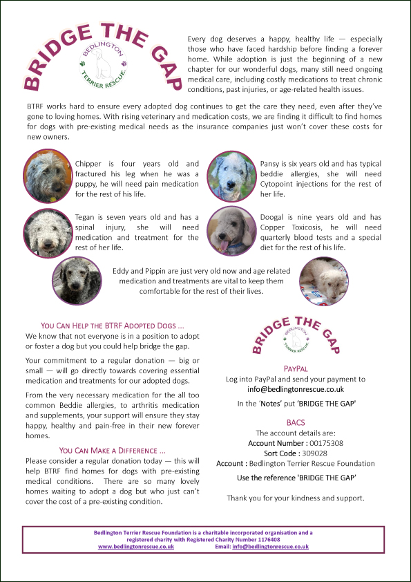 Our new 'Bridge the Gap' scheme is a commitment to a regular monthly donation, however small, that will go directly towards essential medication and treatment for our adopted dogs. This will mean we can help them find the loving homes they deserve and help support the medical treatmrnt in those homes, if needed.