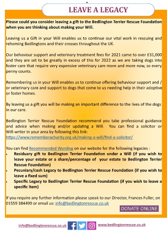• Pecuniary/cash Legacy to Bedlington Terrier Rescue Foundation (if you wish to